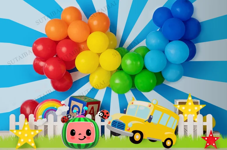 Фон для фотосъемки с изображением арбуза семьи украшения школьного автобуса радужные воздушные шары торта разбивают малыша на 1-й день рождения