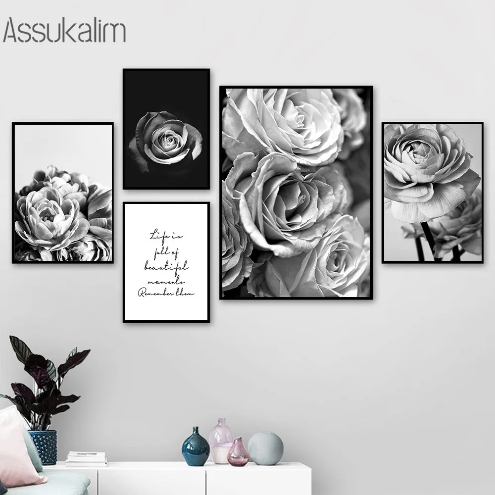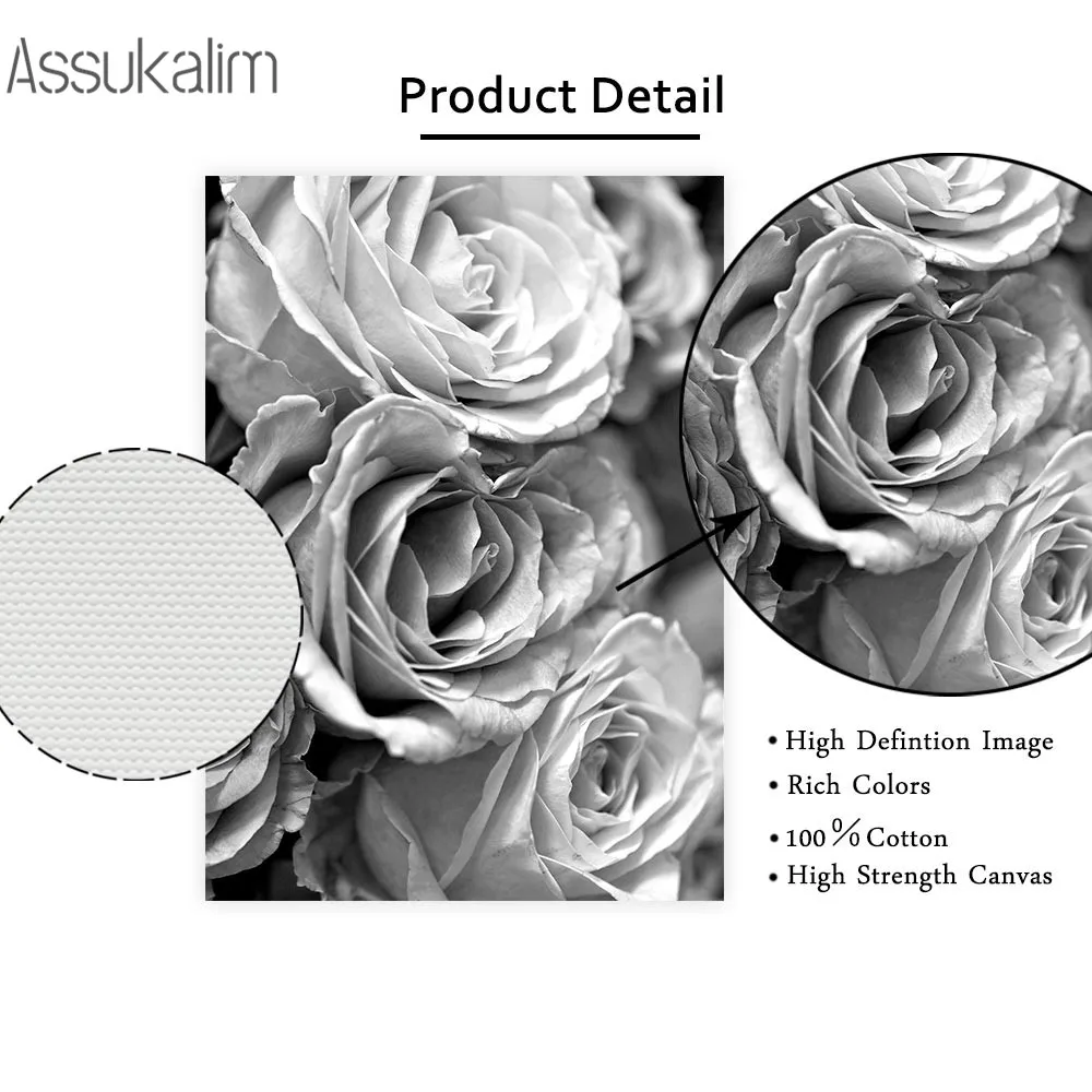 Картина на холсте розовая роза, настенный плакат с цветами, черно-б...