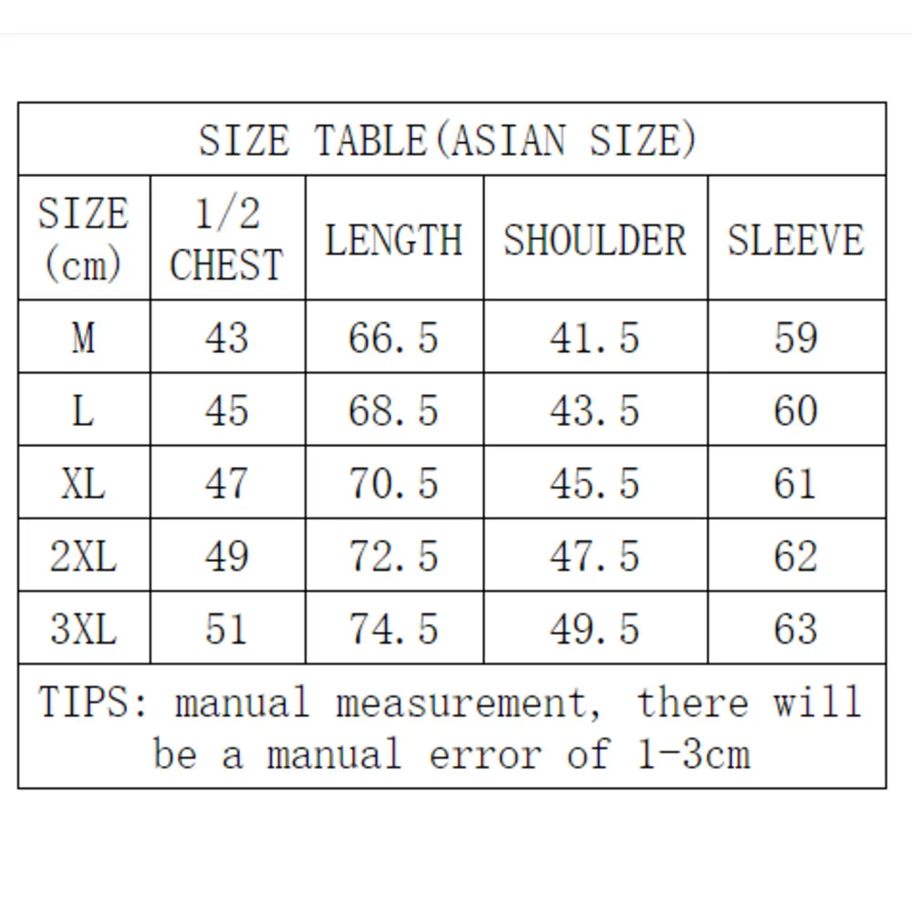 Таблица размеров (Азиатский размер)Размер (см)1/2 грудьДлинаПлечоРукавМ4366,541,559L4568,543,560XL4770,545,5612XL4972,547,5623XL5174,549,563Советы: При ручном измерении возможна погрешность в 1-3 см