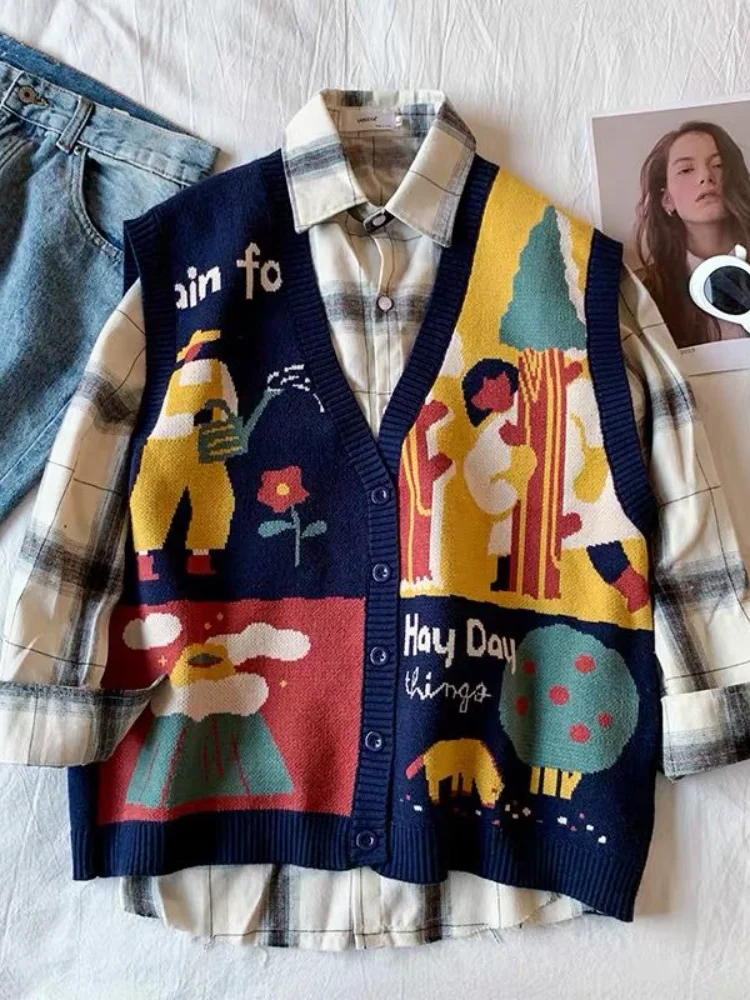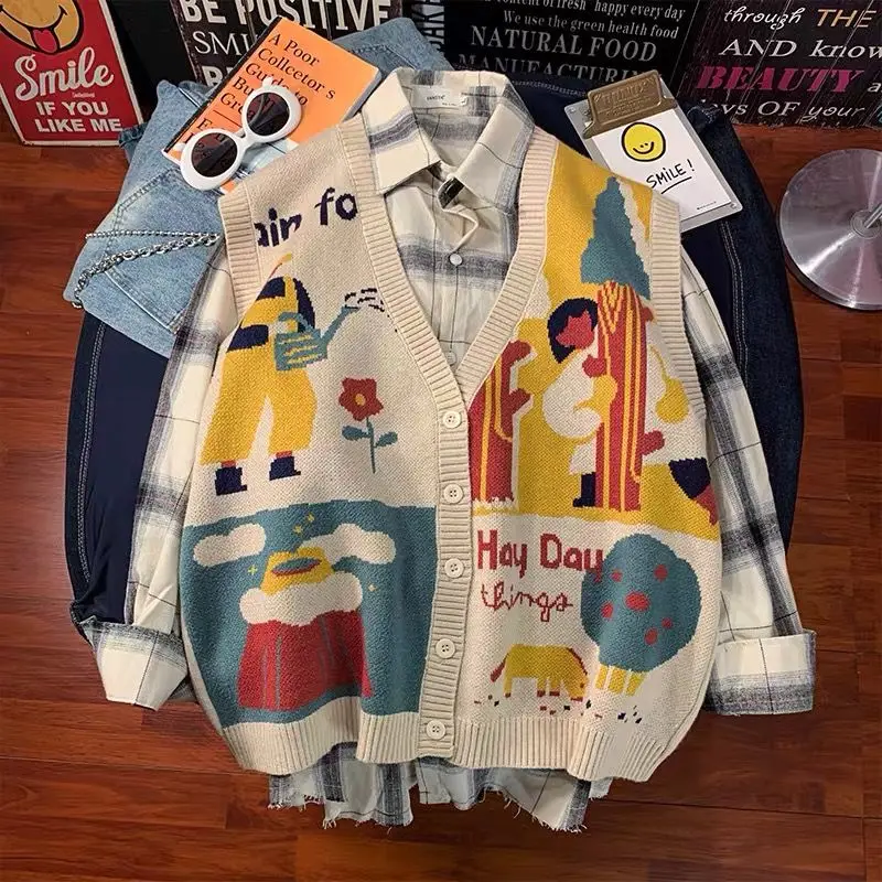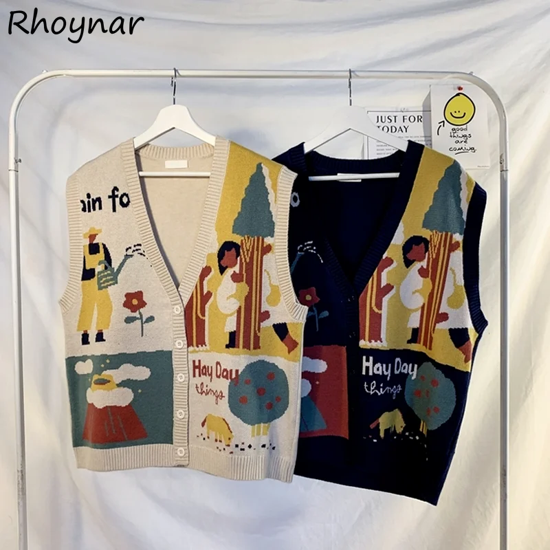 Женский винтажный свитер без рукавов, элегантный милый Универсальный Свободный жилет с V-образным вырезом в стиле преппи, Повседневная Популярная уличная одежда в стиле Харадзюку