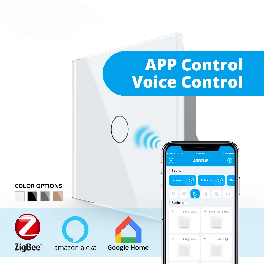 Умные сенсорные настенные выключатели Livolo, европейский стандарт, панель из закаленного стекла, 1 клавиша, 1 канал, беспроводной переключатель, работает с Alexa Zigbee