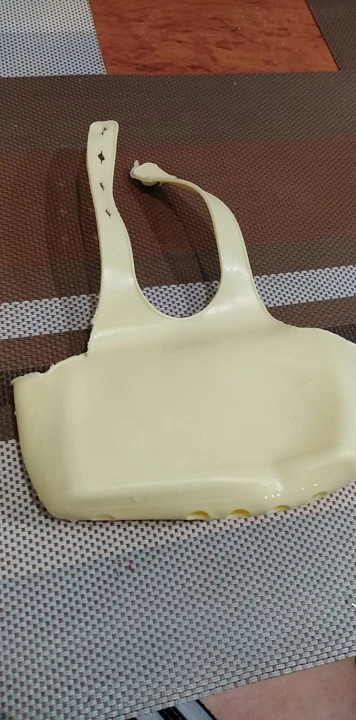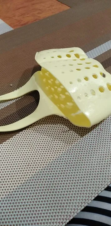 жёсткий силикон, не воняет. пришлось чуть под грузом подержать чтоб выпрямить.