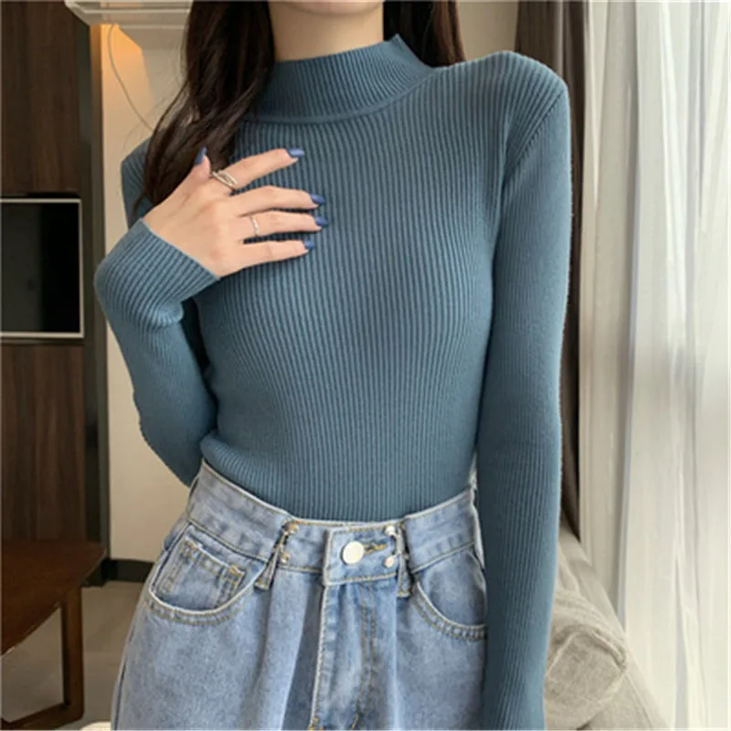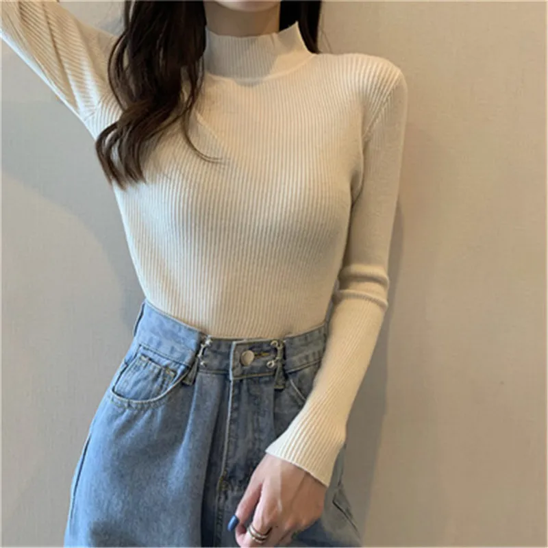 Демисезонные пуловеры с высоким воротником, свитера, Базовые Женские облегающие свитера с длинным рукавом в Корейском стиле, повседневный джемпер, Женский вязаный Топ