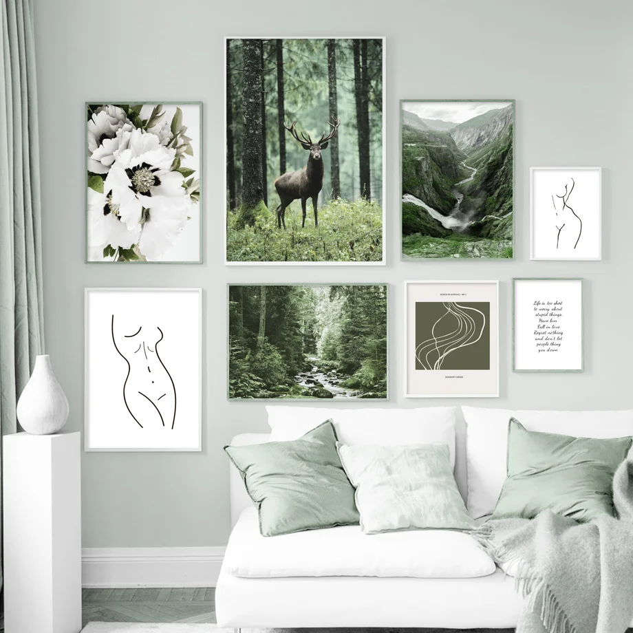 Настенная картина с изображением белого цветка, зеленого леса, олен...