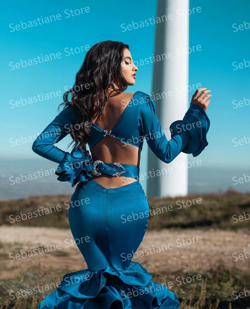 Женское атласное платье с юбкой-годе, синее платье с длинным рукавом, V-образным вырезом, оборками и вышивкой бисером, пышное платье для выпускного вечера