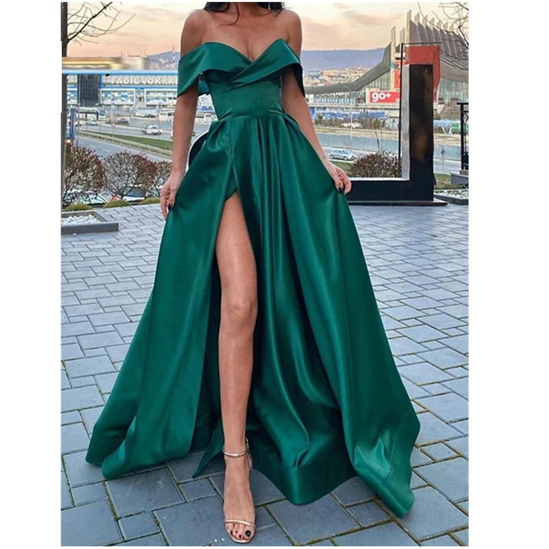 Длинные атласные платья в пол, с открытыми плечами, изумрудно-зеленые, с разрезом для ног, с V-образным вырезом