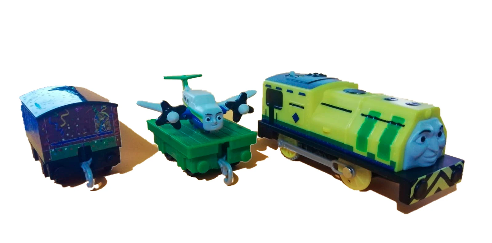 Из описания я поняла, что все паровоз моторизованные. Но оказалось, что это не так. Ребекка идёт без батареек. А так паровозик клёвый, металлический, пр-во Тайланд.