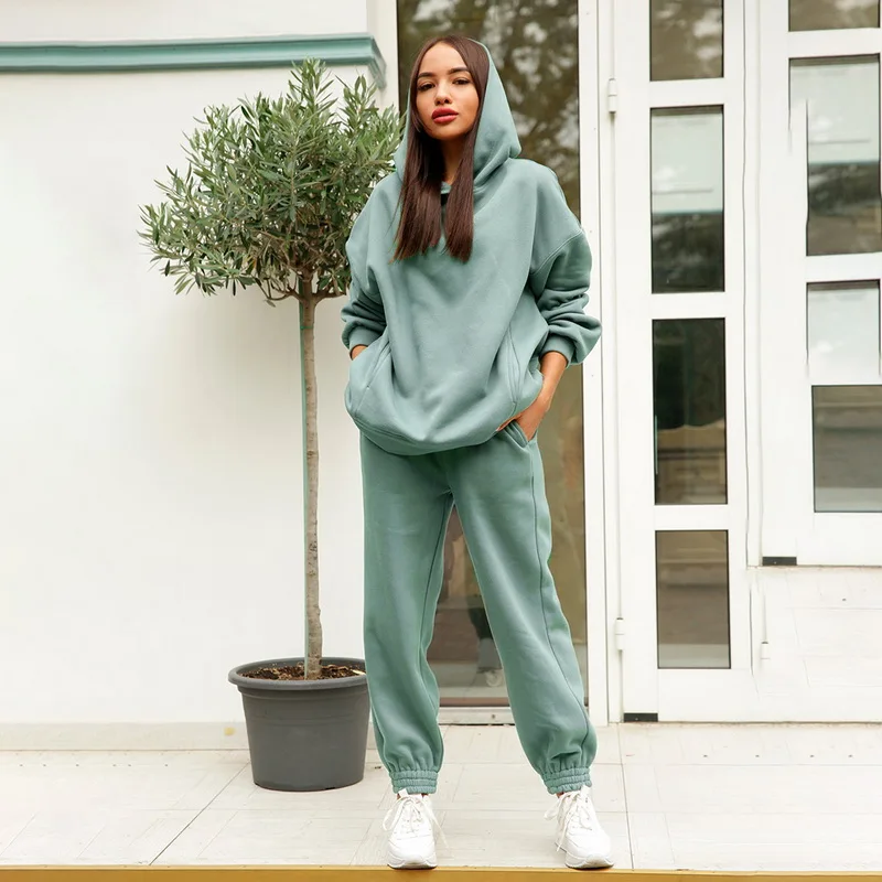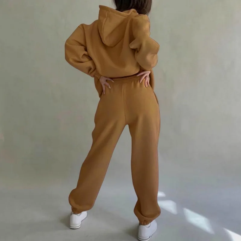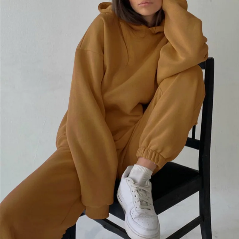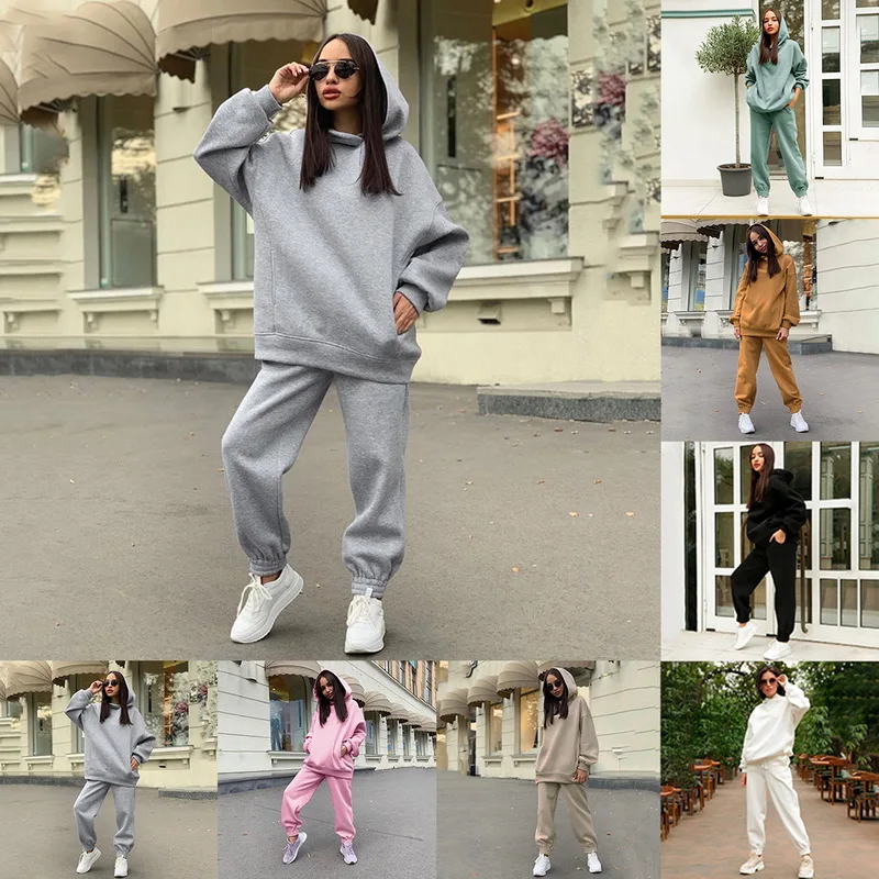 Костюм спортивный женский однотонный из 2 предметов, пуловер с длинным рукавом и капюшоном, свободный спортивный костюм, спортивная одежда для бега и фитнеса