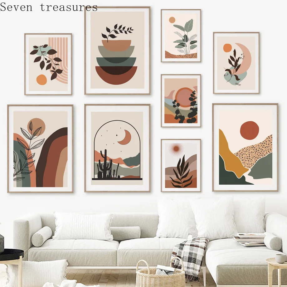 Абстрактное Солнце Луна кактус, листья пейзаж настенное Искусство Холст Живопись скандинавские постеры и принты стены для гостиной декорации