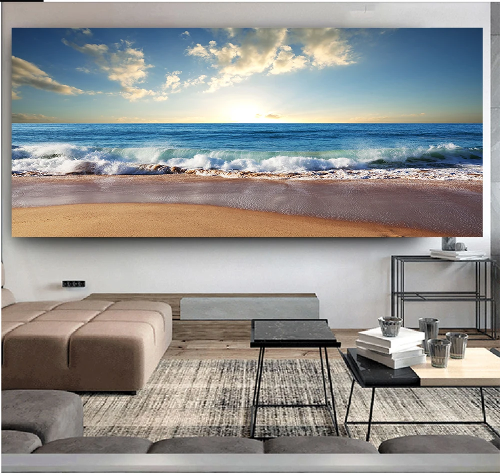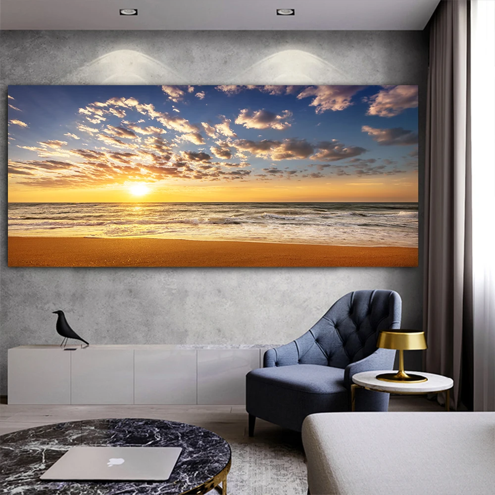 Постер в скандинавском стиле с изображением голубого неба, белых облаков, морского пляжа, волн, пейзажа в сумерках, Картина на холсте, Настенная картина, украшение для дома