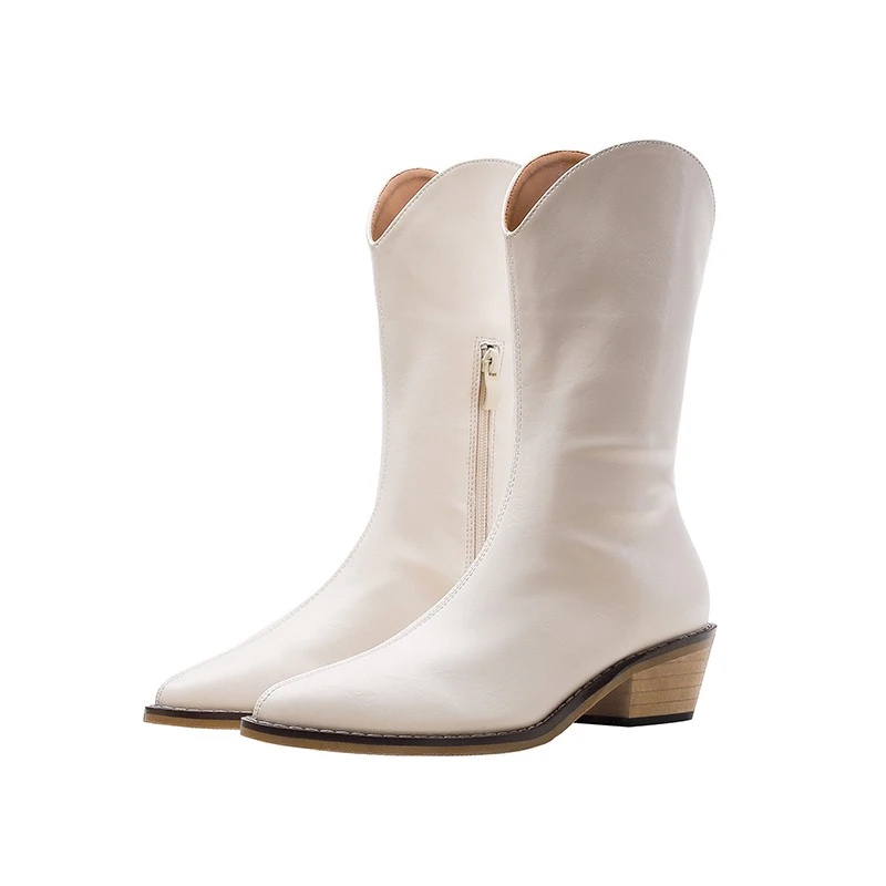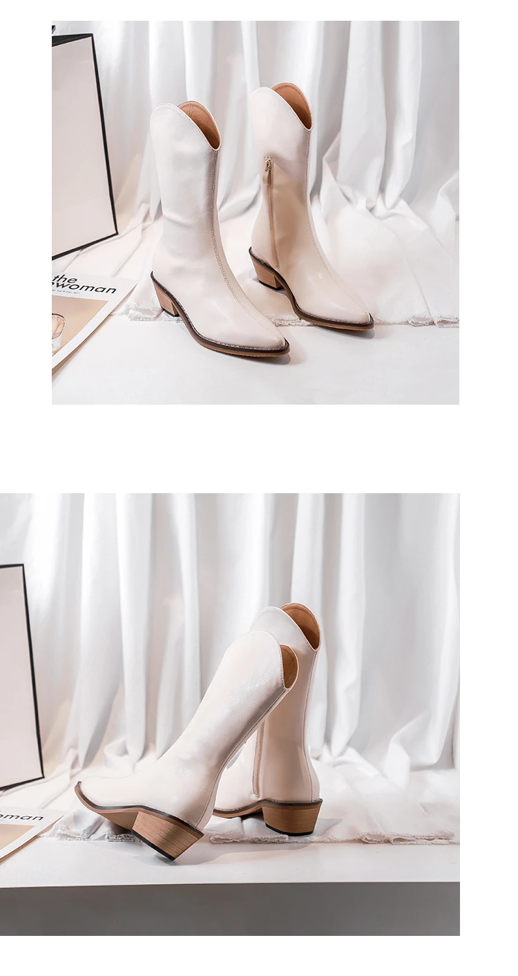 Женские ковбойские сапоги на танкетке, бежевые сапоги до колена на высоком каблуке, с острым носком, осень 2021