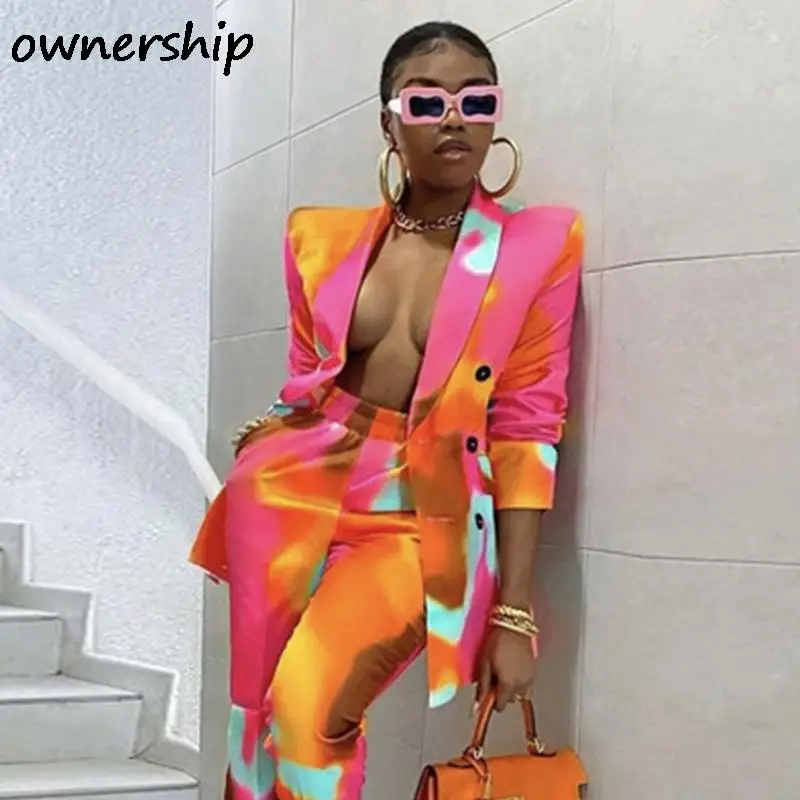 Женский модный комплект с оранжевым пиджаком с принтом, 2021, женский осенний Новый тонкий пиджак на пуговицах с длинным рукавом, повседневные офисные брючные костюмы с высокой талиейUSD 37,44/Шт/Лот 1