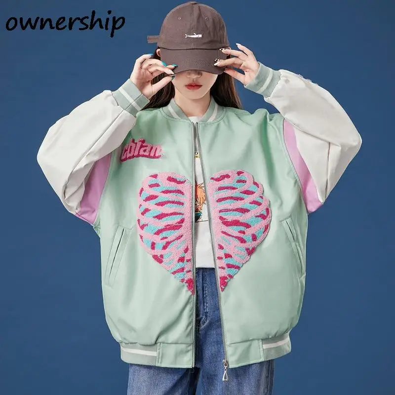 2021 бейсбольное пальто в стиле пэчворк с принтом «любовь», Женская Повседневная Свободная куртка-бомбер большого размера в стиле Харадзюку, Женская Осенняя толстовка с длинными рукавамиUSD 22,76/Шт/Лот 1