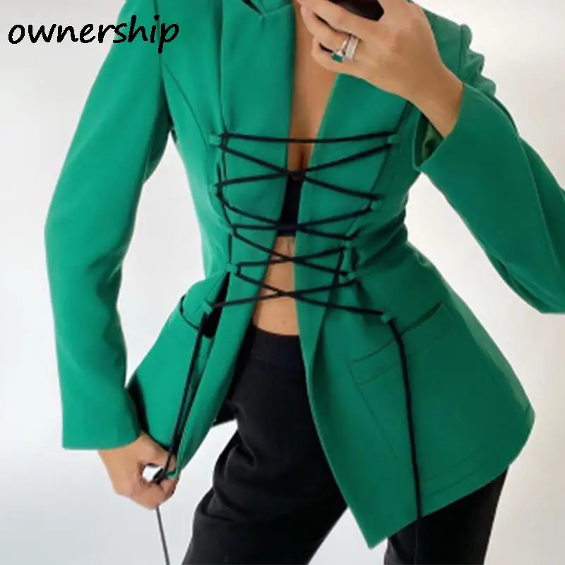 2021 женский сексуальный зеленый Блейзер на шнуровке INS, новое повседневное пальто с длинным рукавом, женские весенне-осенние дизайнерские тонкие костюмы с v-образным вырезомUSD 26,75/Шт/Лот 1