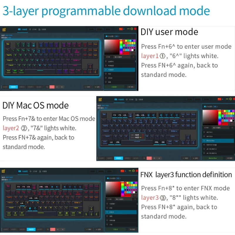 3: с помощью программного обеспечения вы можете записывать макросы, настроить Расширенные функции, персонализировать функциональные клавиши. SK87 также является fn-key rollover и anti-ghosting. Вы можете зарегистрировать столько клавиш, сколько сможете нажать сразу, не пропуская символов в разных режимах. Встроенный блок флэш-памяти может хранить конфигурации на клавиатуре в автономном режиме.