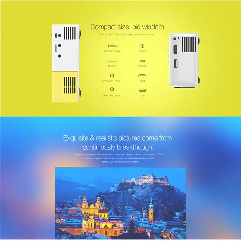 Особенности:① 400 - 600 люменов с контрастностью 800:1 для четких, острых изображений.② С родным разрешением 320x240 пикселей для четких и ярких изображений обеспечивает исключительное качество дисплея.③ Поддержка мультимедийных интерфейсов AV / CVBS / HDMI / USB для dvd-плеера, ноутбука, приставки, игровые консоли и т. д.④ Отделение для удостоверения личности-светодиодный Срок службы лампы составляет более 30000 часов, никогда не нужно заменить.⑤ Инфракрасный пульт дистанционного управления позволяет вам наслаждаться вашей прекрасной жизнью, которая приносит вам беспроводной доступ.Power Питание от литий-ионного аккумулятора (аккумулятор не входит в комплект).Цвет: 16,7 МСтандартная Цветовая температура: 6400KУправление: руководство и пульт дистанционного управления (с инфракрасным пультом дистанционного управления, удобно использовать).Размер проекционного изображения (диагональ): проекция истинного Динамического Изображения до 60 " (20" ~ 60 "зависит от расстояния защиты)Защита расстояние: 0,8 ~ 2 м.Изображение зум: ручной фокусМетод проекции: спереди/сзади и т. Д.Порт HD: идеально подходит для декодирования видео HD 1080pПоддерживаемые форматы Мультимедиа:Форматы видео: AVI, ASF, WMV, TS, MPG, M2P, MP4, FLV, SWF, VOB, MKV, DIVX, XVID, MOV, RMVB, RV, 3GP, DAT, RM, WEBM, Ssif.Поддерживает аудио форматы: MP3, WMA, AAC, OGG, PCM, M4A AC3, WAV, CD, AMR, MP2, APE, DTS, FLAC, MIDI.Поддерживает форматы изображений: JPG, JEP, PNG, BMP, GIF, TIFF, PCX, TGA, EXIF, FPX, SVG, PSD, CDR, PCD, DXF, UFO, EPS, RAW, MPO.Чтение текста: поддержка TXT файла и автоматического флип.Применение: домашний кинотеатр, бизнес-конференции, развлечения, школьные тренировки и так далее.Характеристики:Модель: YG300Однородность: >85%Цветовая гамма: ≥ 100% NTSСтандартные интерфейсы:I / O Интерфейс: 1 * HDMI порт; 1 * AV порт; 1*3,5 мм разъем для наушников (1 шт.) • Стандартный USB порт; 1 * TF слот для карт; 1 * Мощность Вход порт.Потребляемая мощность: 24 ВтПитание: Вход: 100 ~ 240 В пер. тока, 50/60Hz; Выход: 12V / 1.5A.Цвет: белыйОсновной Размер товара: 13,0*8,5*4,5 см/5,1*3,34 * 1.77inОсновной вес изделия: 245 г/8,65 унцийРазмер посылка: 19,8*18,0*8,5 см/7,79*7,0*3,34 дюймаВес посылка: 568 г/20,0 унцийПосылка:1 * YG300 светодиодный проектор1 * Адаптер питания1*3,5 мм RCA аудио-и видеокабель1 * пульт дистанционного управления1 * Руководство пользователя на английском/китайском языках