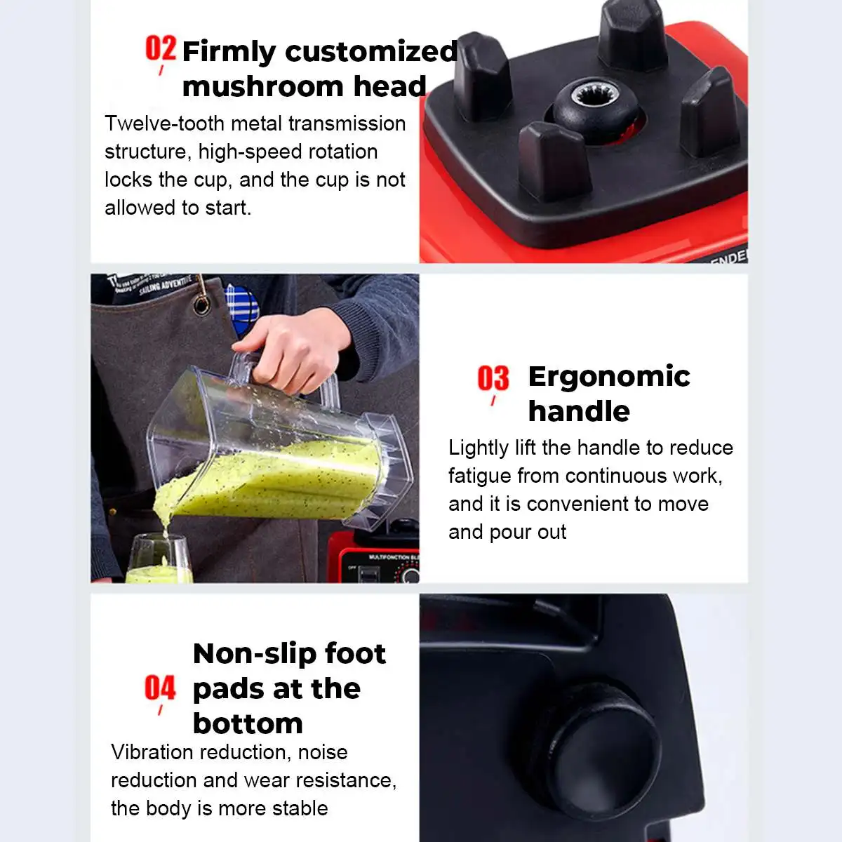 Характеристика:1. Пищевая резиновая крышка стакана, безвредная, безвкусная и не деформированная. В отдельной конструкции более удобно добавлять материалы посередине.2. Контейнер большой, емкость 2,5л, не легко сломать, более химически стойкий и не содержит BPA.3. Этот прозрачный контейнер без капельного носика позволяет наблюдать весь процесс от начала до конца. Она подняла калибровку и может легко измерять ингредиенты в унции, чашке или метрике.4. Контейнер включает в себя влажное лезвие и 2 части блокировки крышки, которая легко снять. Лезвие из закаленной нержавеющей стали ломает кубики пищи и льда в контейнере, что приводит к последовательному сглаживанию эффекта.5,32000 скорости (об/мин) Убедитесь, что блендер может работать стабильно, долгий срок службы. Супер мощный.6. Крышка имеет съемный разъем позволяет добавить ингредиенты во время обработки. Разливные крышки вентиляционные отверстия позволяют горячей и холодной еде расширяться и сокращаться.7. Контейнер имеет мягкую ручку, которая обеспечивает комфортное и нескользящее сцепление. Идеальный размер для семейного ужина и развлечений, предназначен для эффективного вращения большого количества материала обратно к лезвию для более быстрого и плавного смешивания.8. Нескользящие подушечки для ног внизу, амортизация, снижение уровня шума и износостойкость, корпус более стабильный9. Лезвие в контейнере достаточно быстрое, чтобы генерировать фрикционное тепло, позволяя холодным ингредиентам быть паром в течение примерно шести минут. Просто Опустите каплю моющего средства и теплой воды, она очистится в течение 30-60 секунд.Посылка включает в себя:1 блендер1 х тампер(За исключением других украшений)