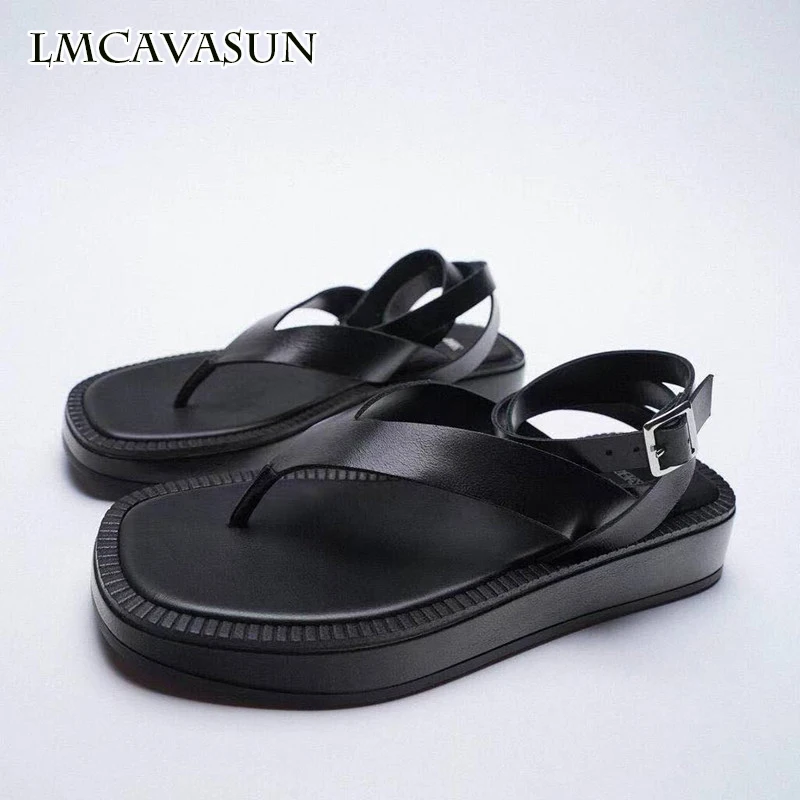 Сандалии LMCAVASUN женские на плоской подошве, кожаные модные шлепанцы, шнуровка, толстая подошва, ремешок на щиколотке, черные, летняя обувь