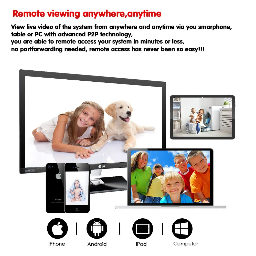 Простая настройка, всего 4 шага для просмотра мобильный телефон, просмотра видео в режиме реального времени из любого места и в любое время с помощью смартфона,Таблица или ПК с передовой технологией P2P, вы можете получить удаленный доступ к вашей системе в течение нескольких минут или меньше, нет необходимости в переадресации,Удаленный доступ никогда не был таким простым!
