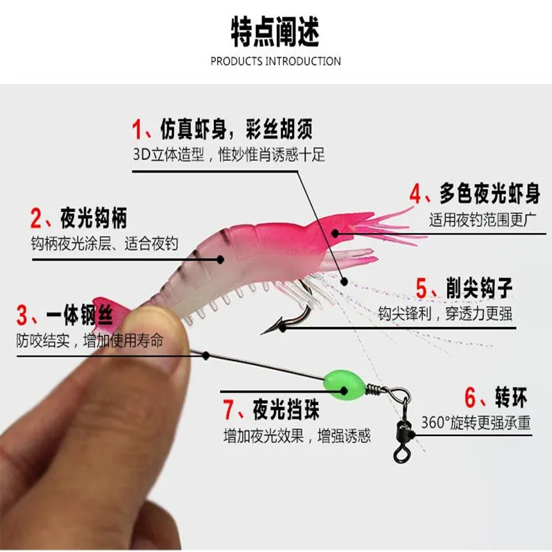 Тип приманки: светящаяся Мягкая приманка для креветокДлина: 7,5 смВес: 5,5 гЦвет: 6 различных цветовМатериал: силиконГлубина погружения: 0-2 мИспользование: приманка для рыбалки