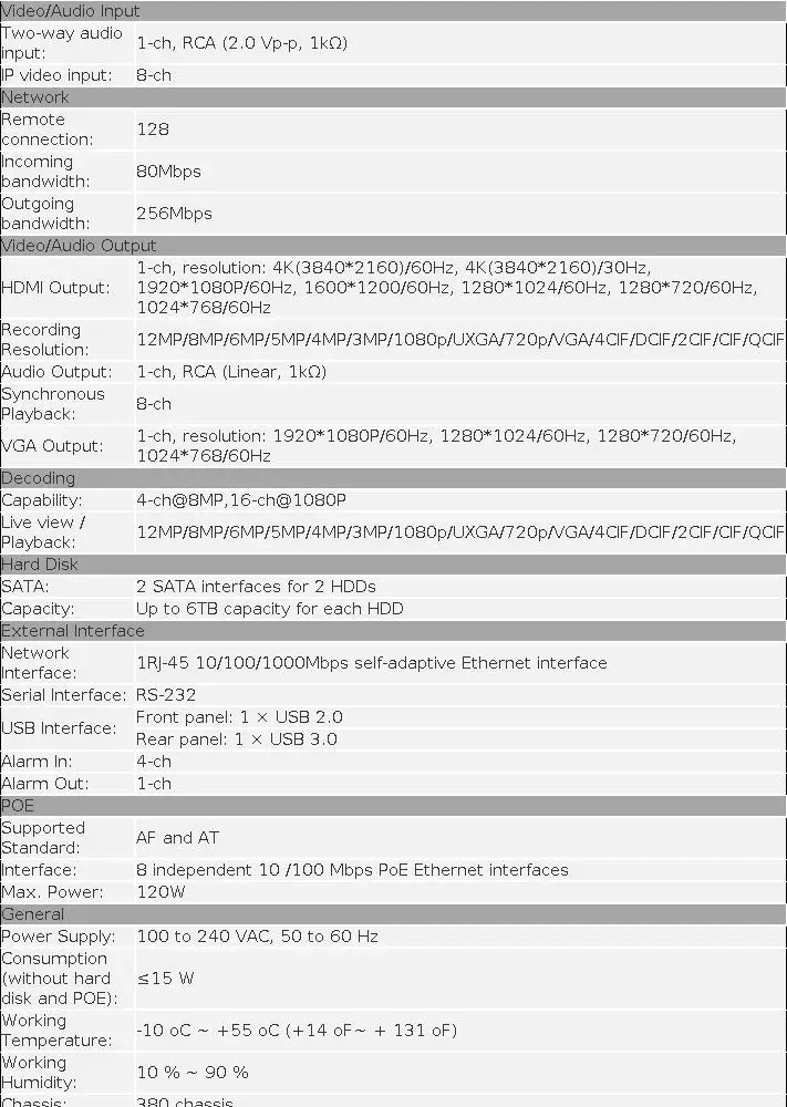 DS-7608NI-I2/8PВстроенный разъем & Play 4K NVR• Поддерживаются вечерние сетевые камеры• Запись разрешения до 12 МП• Поддержка 1-ch HDMI, 1-ch VGA, HMDI с разрешением до 4K(3840x2160)• 8-канальные сетевые камеры могут быть подключены к входящей полосе пропускания 80 м• До 2 интерфейсов SATA• Включай и работай с до 8 независимый PoE сетевой интерфейс• Поддержка двойной ОС для обеспечения высокой надежности работы системы• Поддержка различных сигналов обнаружения VCA и поиска VCA• Поддержка видео форматов H.265/H.264/MPEG4