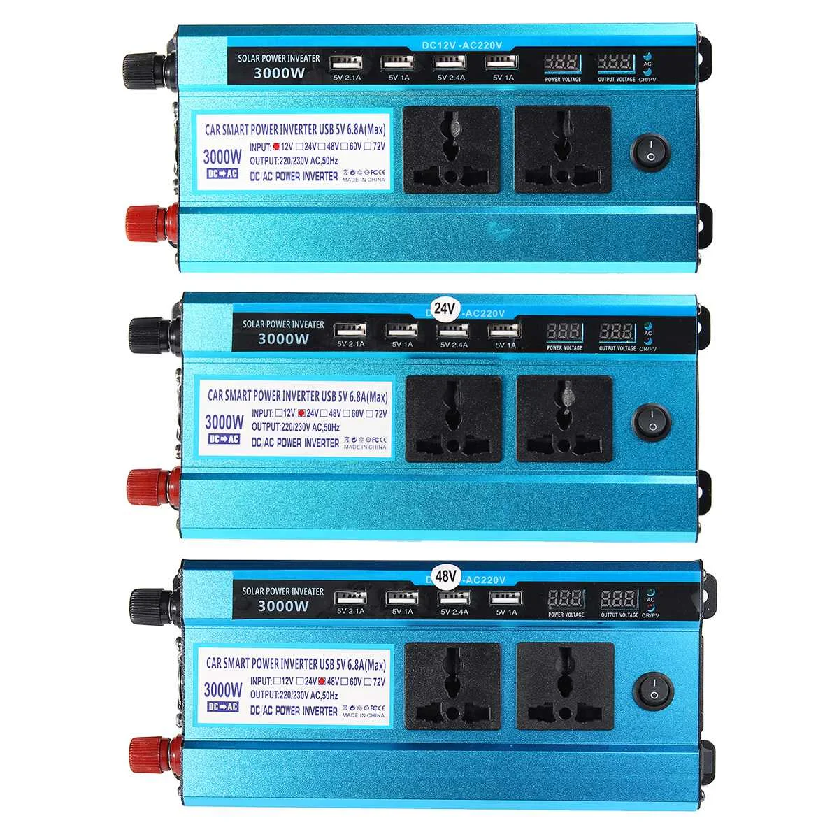 Пиковая мощность: 3000 Вт/4000 Вт/5000 Вт-Входное напряжение: DC12V/ DC24V/DC48V-Выходное напряжение: ac220вВнимание:-Напряжение инвертора должно быть таким же, как напряжение батареи, в противном случае инвертор не будет работать или быть поврежден.-Нельзя использовать на кофемашине.Особенности:-Интеллектуальный двойной цифровой дисплей, поддержка батареи адаптера солнечной панели.-Защита от перегрева, защита от высоких и низких температур, защита от перегрузки, защита от короткого замыкания и т. д.-Высокий коэффициент конверсии, снижение потери конверсии, непрерывное напряжение.-Интеллектуальный бесшумный вентилятор с контролем температуры, вентилятор автоматически запустится при запуске инвертора.Примечание:Благодаря светильник и экрана Цвет Товара может быть s светильник ly отличается из-за характеристик монитора компьютера.Возможны незначительные отклонения в размерах из-за различных измерений вручную.