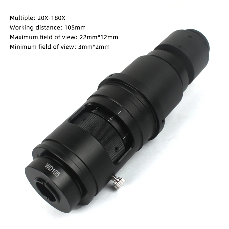 WD105 линзы с резьбовым соединением типа C: (1/3 дюймовый чип камеры, 20X-180X на 21,5-дюймовым монитором, полный фокуса)