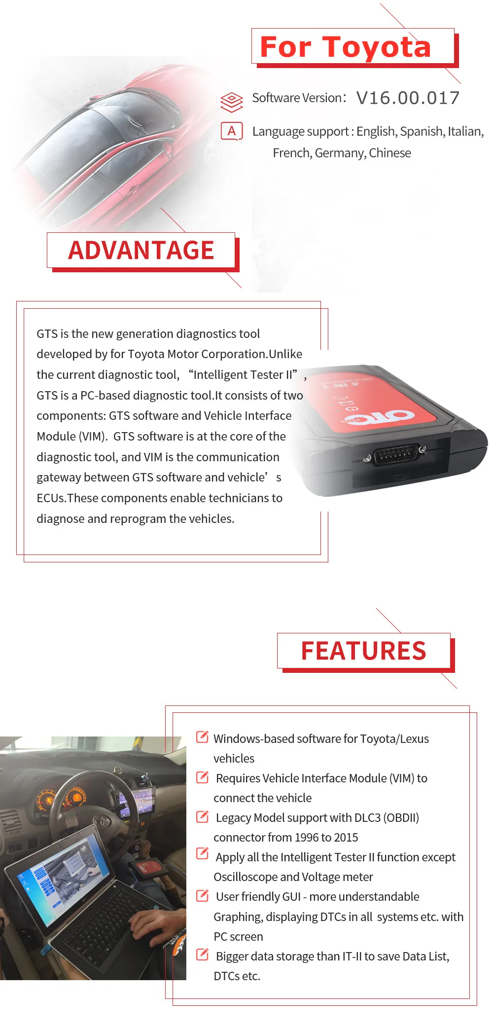 Он состоит из двух компонентов: программного обеспечения GTS и модуля интерфейса транспортного средства (VIM). Программное обеспечение GTS является ядром диагностического инструмента, а VIM-шлюз связи между программным обеспечением GTS и ECUs транспортного средства. Эти компоненты позволяют техникам диагностировать и перепрограммировать транспортные средства.