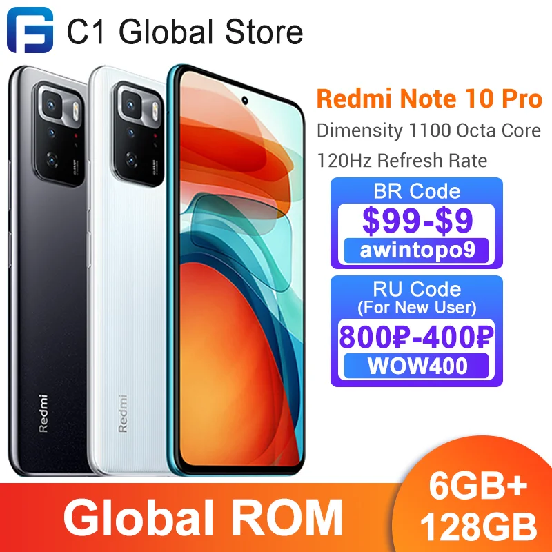 Смартфон Xiaomi Redmi Note 10 Pro с глобальной прошивкой, 6 ГБ ОЗУ, 128 Гб ПЗУ, Восьмиядерный процессор Dimensity 1100 дюйма, дисплей 120 Гц, камера 64 мп, 5000 мАч