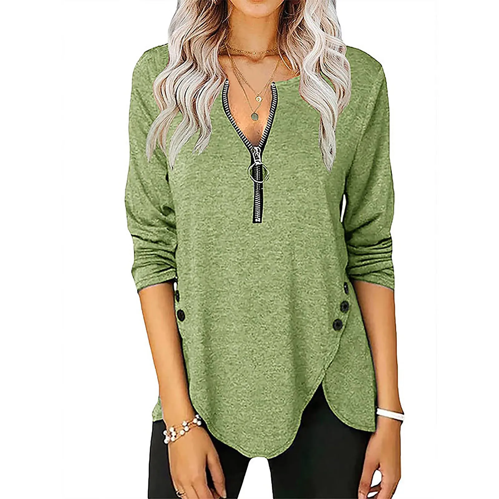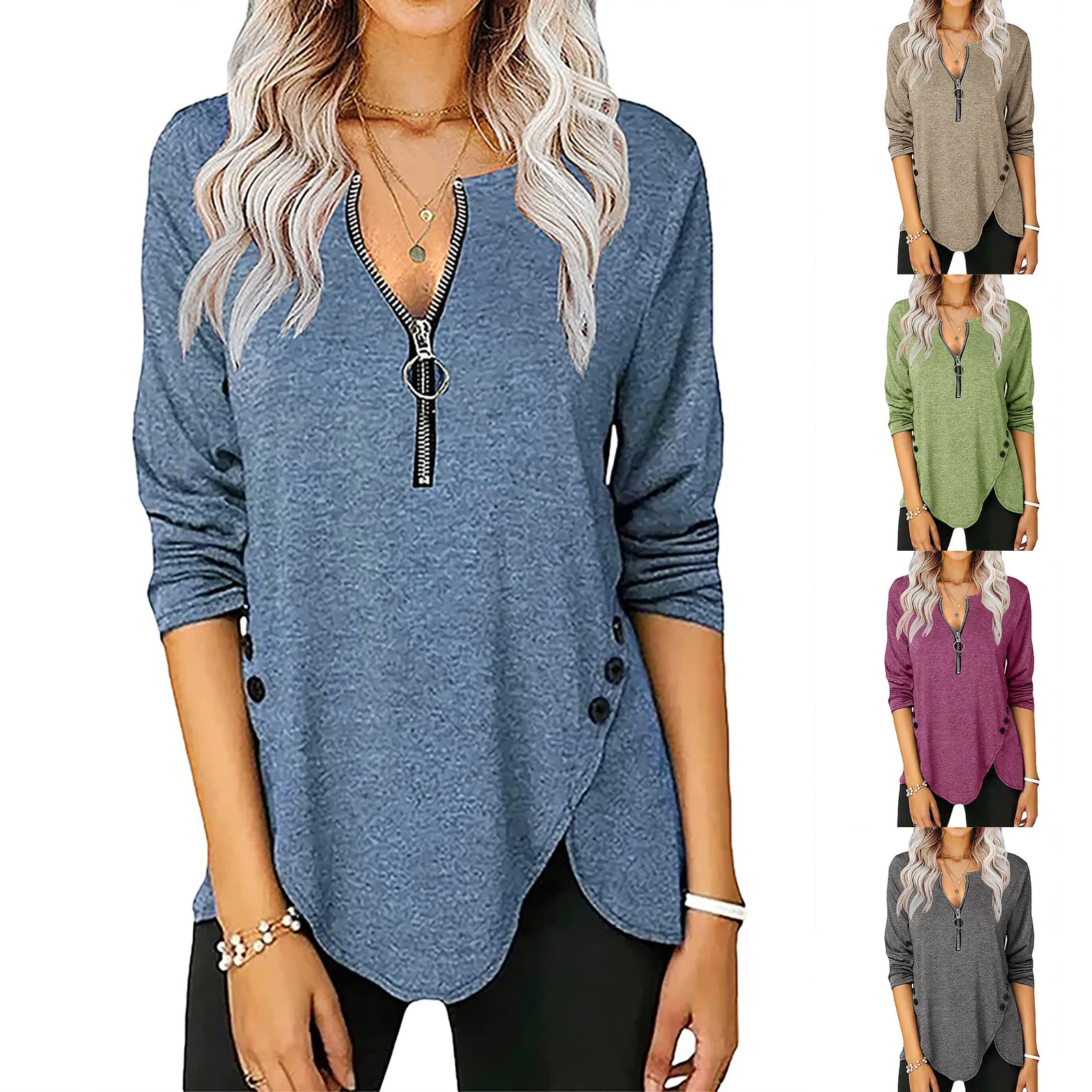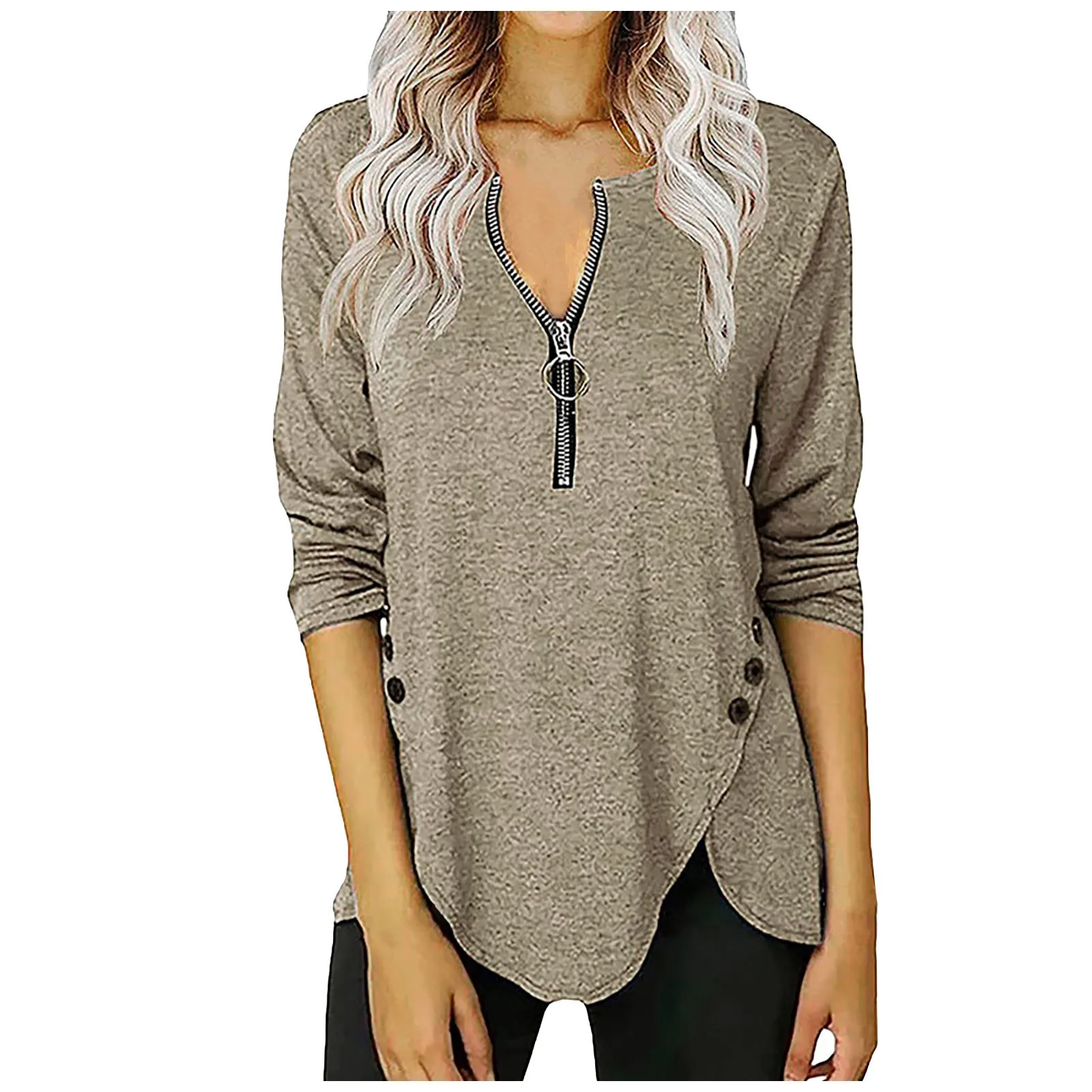 Женская Повседневная Осенняя футболка на молнии с длинными рукавами и v-образным вырезом на пуговицах