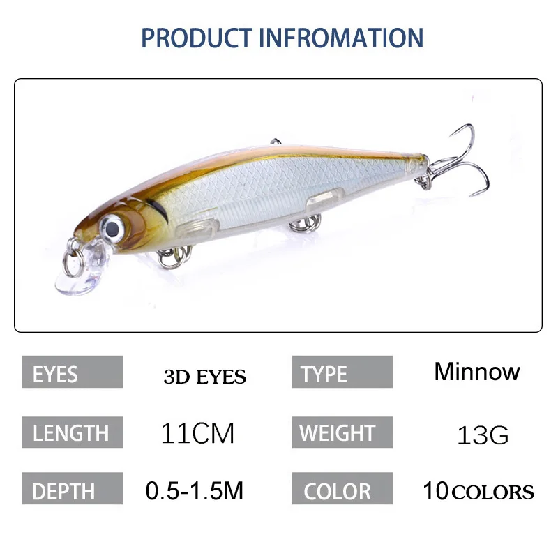 Тип приманки: Рыболовная Приманка MinnowДлина: 10/11/13, 5 смВес: 7,5/13/18.5gГлубина погружения: 0,5-2 мМатериал: Сплав/пластикЦвет: 35 разных цветовКачественный крючок: сильный тройной крючокТип: 1 # -35 #Посылка: 1 * рыболовная приманка