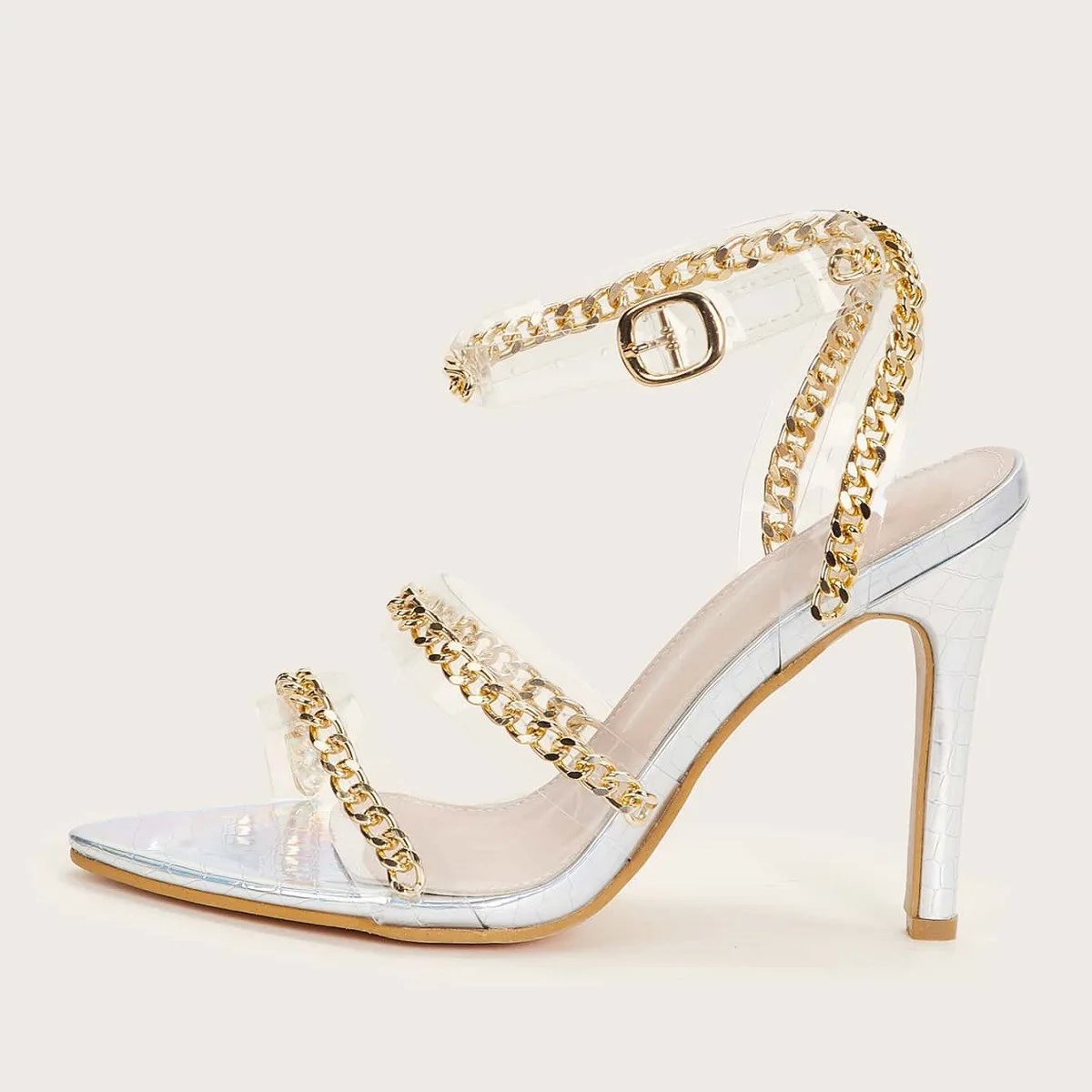 Босоножки женские свадебные на высоком каблуке, пикантные сандалии с заостренным носком, высоким каблуком и цепочкой, сандалии с открытым носком в римском стиле
