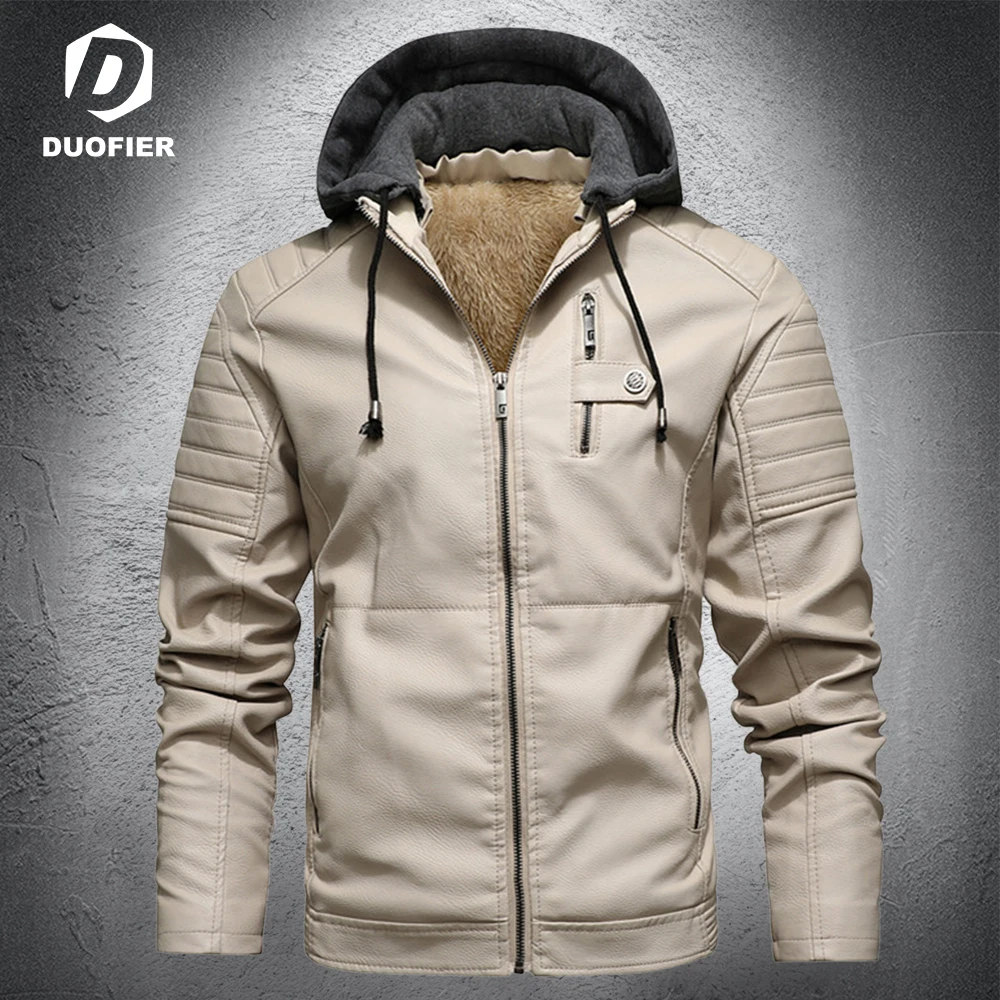 Куртка мужская из ПУ кожи, с флисовой подкладкой и капюшоном, на осеньзиму