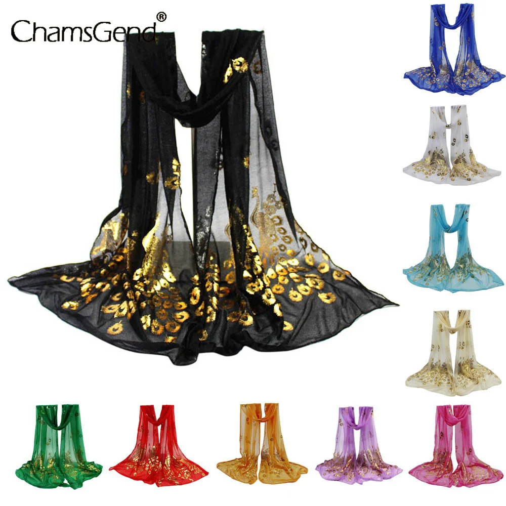 Женские шифоновые шарфы с золотым принтом павлина, модная летняя морская пляжная шаль, Женская шаль, шарфы, винтажная пляжная шаль