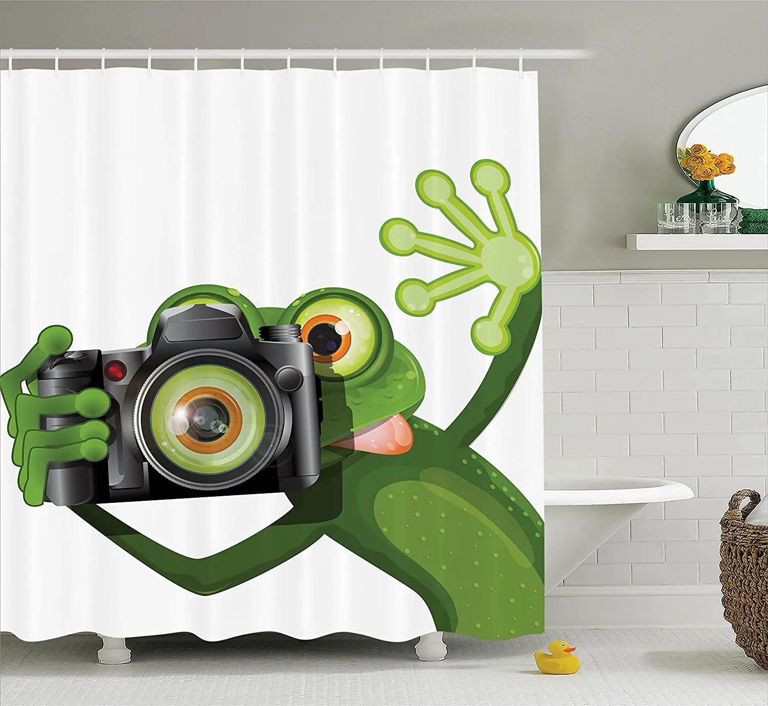 Занавеска для душа в форме животного фотограф Веселая зеленая лягушка с камерой симпатичная забавная занавеска для ванной комнаты с принтом