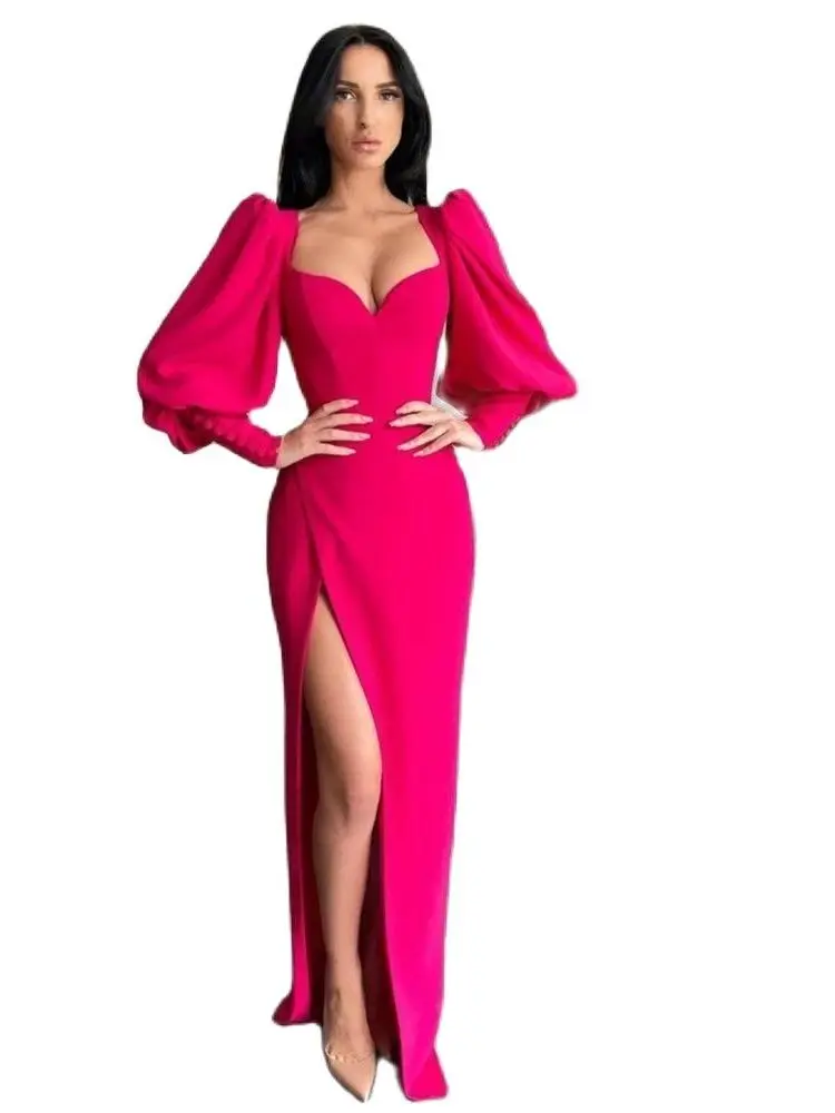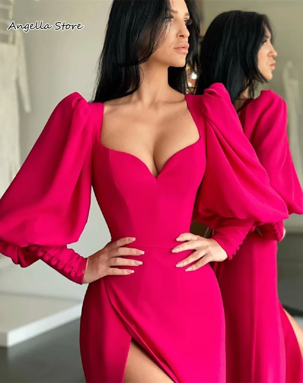 Женское атласное вечернее платье, атласное платье цвета фуксии, с пышными длинными рукавами, с разрезом сбоку, с сердечками, для выпускного вечера, 2021