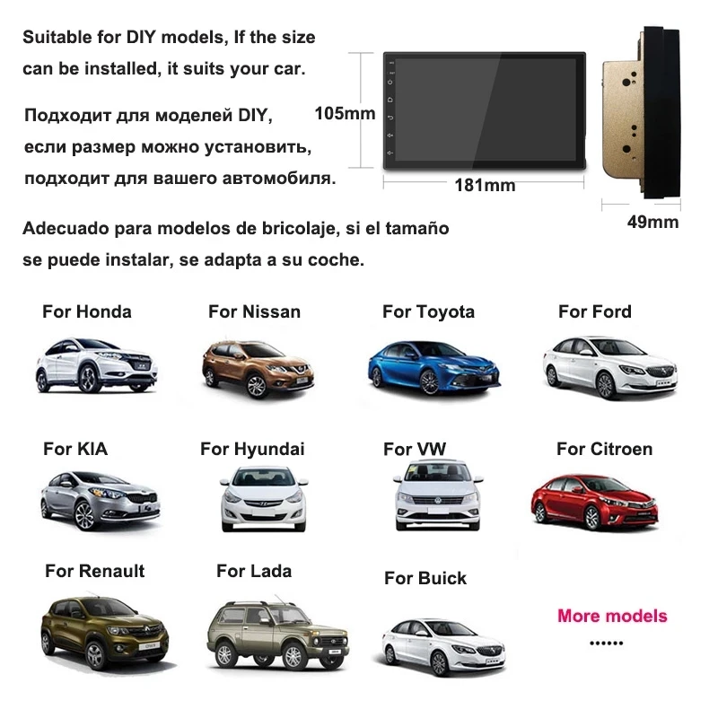 Это Универсальная головка 2 Din, подходит для большинства старых автомобилей, пожалуйста, проверьте размер товара, подходит ли для вашего автомобиля.Для некоторых транспортных средств необходимо приобрести дополнительную раму в Aliexpress или в вашем местном автомобильном магазине. Мы не можем убедиться, что устройство будет на 100% совместимо со всеми указанными ниже транспортными средствами, пожалуйста, убедитесь, что форма и размер подходят для вашего автомобиля, прежде чем вы его закажете, спасибо!