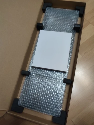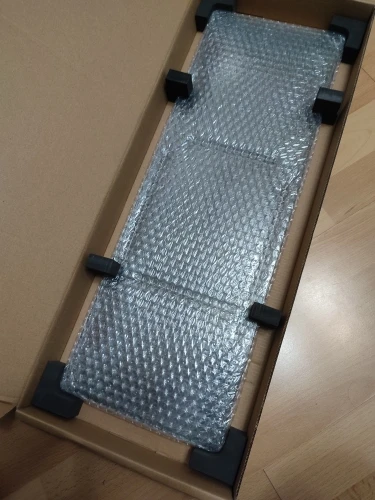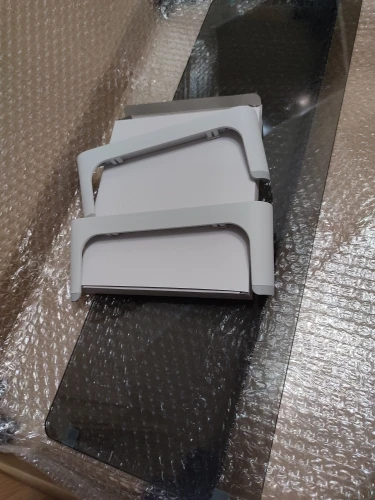 упаковано очень хорошо и надёжно, вся коробка в пупырке (к стати достаточно большая), стекло внутри в воздушной прослойке из пупырки и пены, полка достаточно длинная, шире моего монитора 24'' чего конечно не ожидал, смотрится конечно громоздко, но в целом всё устраивает, пластиковые ножки прорезинены