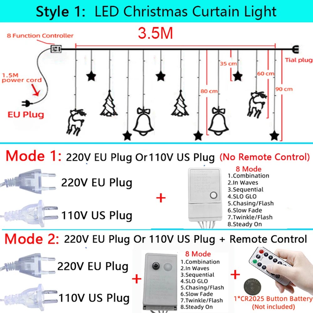 Рождественская гирлянда, гирлянда, Светодиодная звезда, олень, Сказочная гирлянда, занавески для улицы, 220 В, 110 В, для дома, для свадебной вечеринки, Новогоднее украшениеХарактеристики:Стиль 1: светодиодный светильник для рождественской занавескиЦвет: теплый белый, разноцветныйВодонепроницаемость: IP44Материал: медная проволока + пластиковая крышкаДлина: 3,5 мВысота: 0,3 м-1 мКоличество подвесок: 2 колокольчика, 2 оленя, 2 Рождественская елка, 6 маленьких звездНапряжение: 220 В переменного тока/110 ВСтандарт штепсельной вилки: штепсельная вилка европейского стандарта/штепсельная вилка американского стандартаСвинцовый провод (линия): 1,5 м8 режимов • Питание: 1. Постоянный светильник режим 2. Режим вспышки 3. Мигающий режим 4. Непрерывный режим 5. Режим волны 6. Fantasy 7. Свое существование режим 8. Медленный режим вспышкиРежим 1:220 В штепсельная вилка европейского стандарта или 110 В штепсельная вилка европейского стандарта(Без пульта дистанционного управления)Режим 2:220V ЕС вилка + пульт дистанционного управления УправлениеМодель батареи дистанционного управления: 1 * CR2025 кнопочный аккумулятор(Не входит в комплект)Стиль 2: Светодиодный светильник для занавесок с маленькой звездойЦвет: теплый белый, разноцветный, холодный белыйМатериал: медная проволока + пластиковая крышкаВодонепроницаемость: IP44Длина: 2,5 мВысота: 0,55 М-0,85 мКоличество подвесок: 10 маленьких звездочекНапряжение: 220 В переменного токаСтандарт штепсельной вилки: штепсельная вилка европейского стандартаСвинцовый провод (линия): 1,5 м8 режимов • Питание: 1. Постоянный светильник режим 2. Режим вспышки 3. Мигающий режим 4. Непрерывный режим 5. Режим волны 6. Fantasy 7. Свое существование режим 8. Медленный режим вспышкиРежим 1:220 В штепсельная вилка европейского стандарта или 110 В штепсельная вилка европейского стандарта(Без пульта дистанционного управления)Часто задаваемые вопросы:В1: Могу ли я подключить различные огни вместе?О: Да, вы можете выбрать для подключения различных наборов вместе, чтобы сделать свет дольше. Есть разъем на конце каждый светильник Комплект для подключения различных светильник s вместе. (Батарея-приведенный в действие не может быть соединены друг с другом)В2: Можно ли использовать лампы на открытом воздухе?О: да, светодиодные фонари водонепроницаемые, но, пожалуйста, хорошо Защитите контроллер и концевые разъемы или батарейный блок, если вы хотите использовать их снаружи, потому что контроллер и конечный разъем или аккумулятор не являются водонепроницаемыми, пожалуйста, обратите на это внимание.