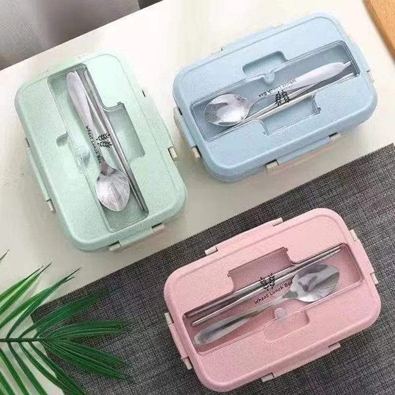 Коробка бэнто для микроволновой печи с ложкой, палочки для еды, контейнер для хранения, посуда из пшеничной соломы, детский школьный рабочий офисный Ланч-бокс