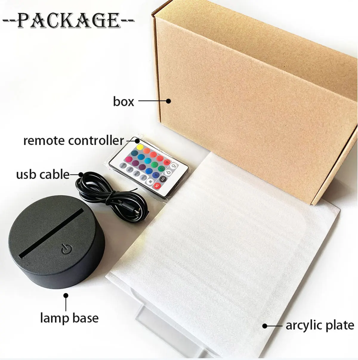 ✔1 * Оптическая акриловая панель, размер в 200*150*4 мм✔1 * Основание лампы ABS, размер: 85 85*40 мм✔1 * пульт дистанционного управления (необходимо выбрать с или без)✔1 * кабель Micro USB, длина: 1 м✔1 * Руководство пользователяОбратите внимание:● Перед использованием снимите защитную пленку.● Чтобы не оставлять отпечатков пальцев на поверхности акриловой панели, пожалуйста, держите доску только на кромке, а не спереди.Чтобы получить потрясающий ночной Светильник 3D illusion, нажмите кнопку «Добавить в корзину».