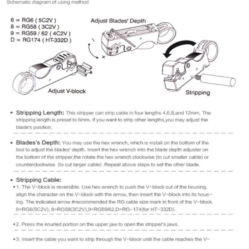Легко использовать, зафиксировать инструмент над кабелем, вращать по часовой стрелке, затем снять нежелательную частьИзготовлен из ударопрочного материала; Экономичный, но высокопроизводительныйМожет установить различные глубины резки в соответствии с различными кабелями