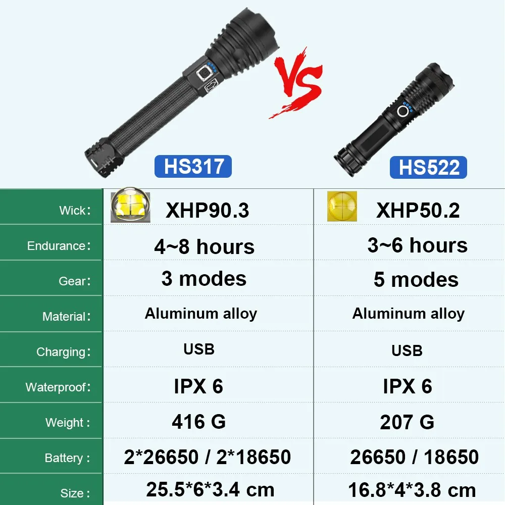 Параметры продукта HS522• Бренд: PAWEINUO• Номер продукта: HS522• Модель светодиодный бусины: CREE XHP50.2• Диапазон: 300-500 метров• Режим масштабирования: телескопический зум• Режим переключения: 5 режимов (High - Medium - Low - SOS - Flash)• Тип батареи: 26650 или 18650• Время освещения: 4-6 часов• Размер: 16,8 см * 4 см * 3,3 см• Фонарь Вес нетто: 0,207 кг• Способ зарядки: быстрая зарядка через USB• Уровень водонепроницаемости: IPX-6• Цвет корпуса: черный• Материал: T6063-T6 авиационный алюминий