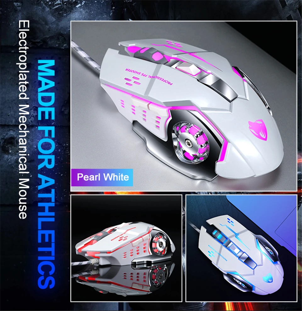 Проводная USB программируемая игровая мышь, 7 видов цветов светильник, 6 кнопок, 3200DPI, Механическая игровая мышь, бесшумная эргономичная мышь для Pro Gamer Особенности:Эргономичный дизайн, подходит для всех видов ручного типа и компьютера.6 клавиш, более удобны для игровых операций.Виды DPI Регулируемая обеспечивает точное позиционирование.Пользовательские настройки макросов, идеально подходят для более сложных игр.Спецификация:Кнопки: 6 кнопокПодсветка: в наличии 7 цветов, охлаждающаяся лампаРазрешение: 1000/1600/3200/6400 DPI регулируется.Ключевая жизнь: 10 миллионов раз.Размер: 138*80*38 мм.Вес: 150 г.Пользователь для: высококлассных игроков и профессиональных геймеров для Dota,LOL,CSGO и т. д.Теплые советы: «колесо» на боковой стороне мыши является просто украшением, не может вращаться. Спасибо за понимание.Посылка включает:1 x Проводная компьютерная игровая мышь.