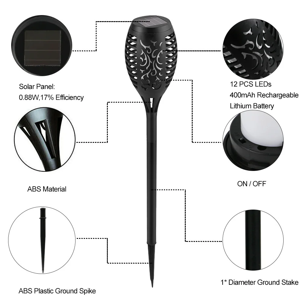 Светодиодный: 12 Светодиодный sЦвет: теплый белый (3000k)Уровень водонепроницаемости: IP65Материал: АБС-пластик + ПоликарбонатРежим освещения: режим мерцания пламениВыключатель питания: ВКЛ./ВЫКЛ.Режим автоматического переключения: светильникСветодиодный срок службы: 50000 чЯркость: 35 лмВремя зарядки на солнечной батарее: 8 чВремя работы: светильник 12 часов летом и 5 часов зимой после полной зарядки.Литий-ионный аккумулятор Батарея: 3,7 V 400mAh