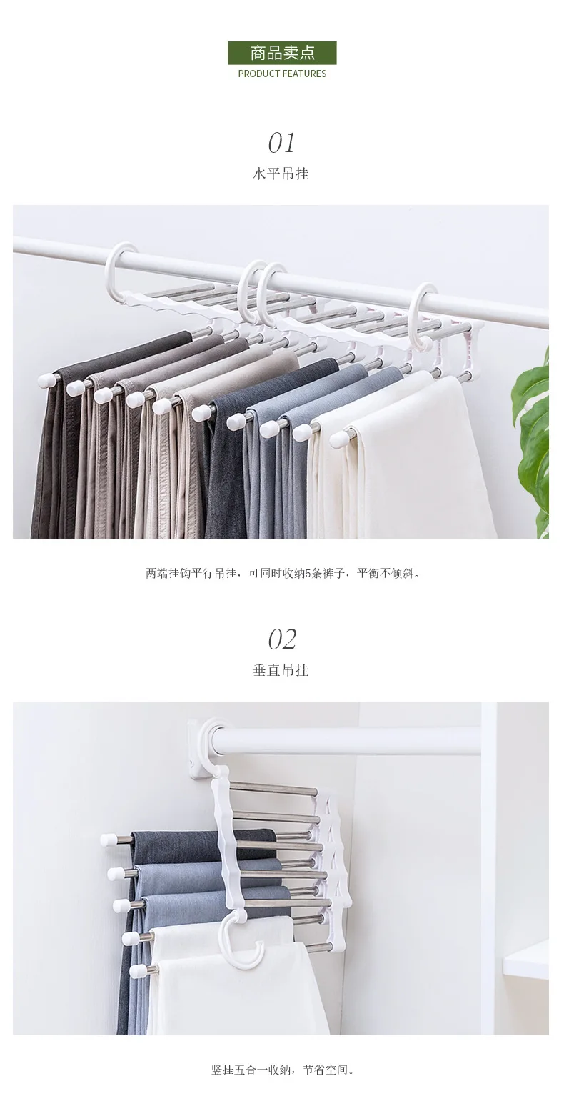 2. Компактный дизайн: регулируемый стеллаж для хранения можно вешать на двух крючках или его можно повесить вертикально, он может одновременно удерживать до 5 пар штанов, и это сделает ваш гардероб тише.