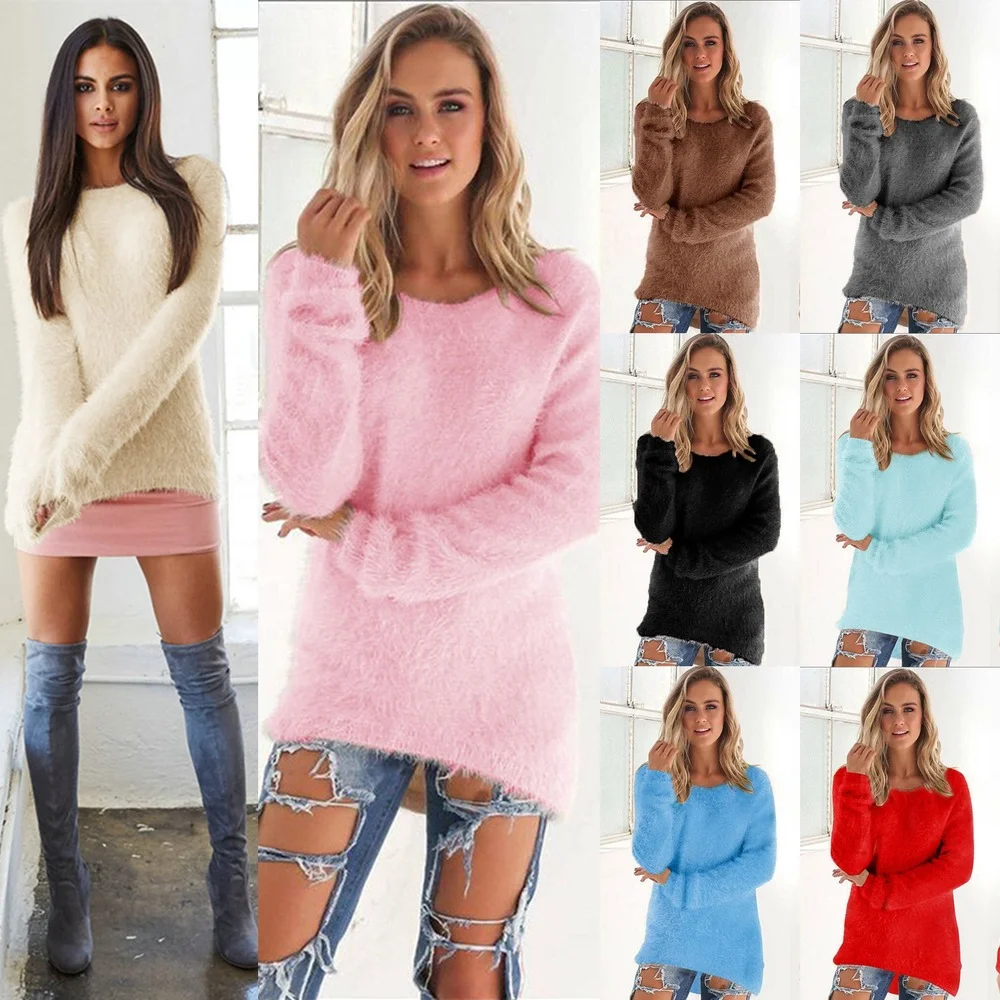 Женский Повседневный шерстяной пуловер, свободный свитер с длинным рукавом и круглым вырезом, Однотонный женский пуловер, сексуальный топ на весну и осень