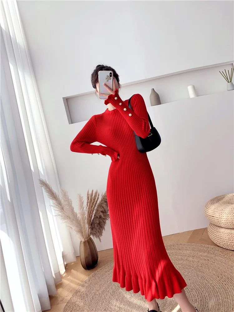 Осеннее вязаное длинное платье, женское однобортное платье с V-обра...