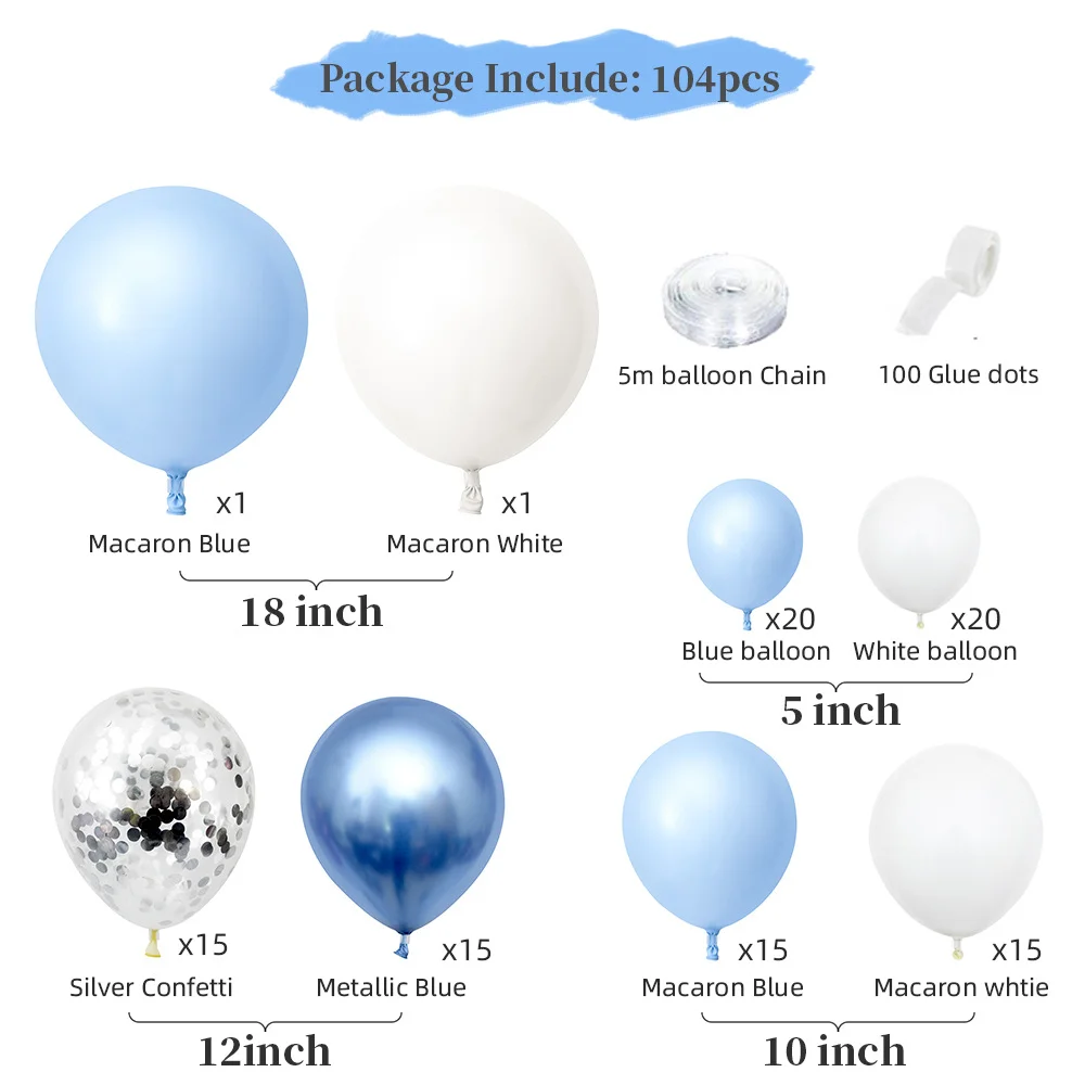 Синяя тема содержит: (набор из 104 шт.)18 дюймов белый 1 шт, синий 1 шт15 12-дюймовый блестками воздушные шары, 15 синий металлик10 дюймов macaron синий 15 и белый 155 дюймов Макарон синий 20, белый 201 точка клея, 1 цепь клеяРозовая тема включает в себя: (набор из 109 штук)2 цвета розового золота 4D шары, 5 18 дюймов розовыйДо 5 лет, 12 предметов в упаковке-дюймовое металлическое красного цвета, 5 серебро10 дюймов Макарон розовый 60 шт, Белый 10 шт5 дюймов Макарон белый 20 шт1 точка клея, 1 цепь клея