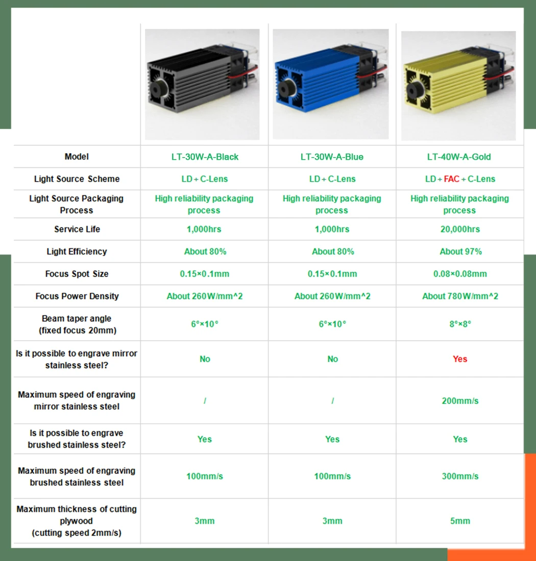 Режущий материал --- фанера, кожа, бамбук, черный акрил, кожа, МДФ и т. Д.Характеристики:Мощность лазера: LT-40W-A-Gold/LT-30W-A-Black/LT-30W-A-Blue (опционально)Материал: алюминиевый сплав + пластикСветильник Цвет: синийДлина волны: 450нмФорма Facula: пунктиформа, регулируемый фокусВходное напряжение: 12 В 2 АПараметры интерфейса: Поддержка TTL сигнала управления питаниемРазмер изделия: 12*4*4 смРазмер посылка: 14*6,2*6,2 смВес изделия: 300 гПосылка:1 * лазерная головка